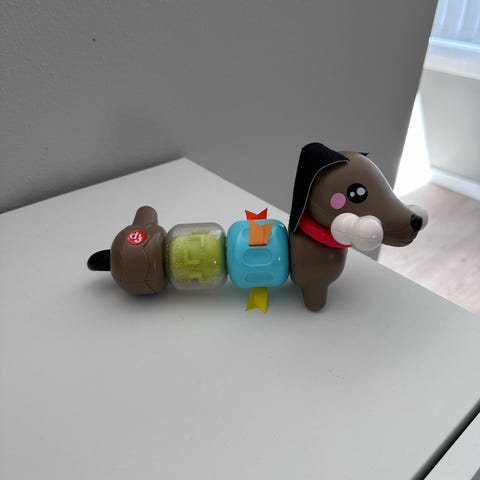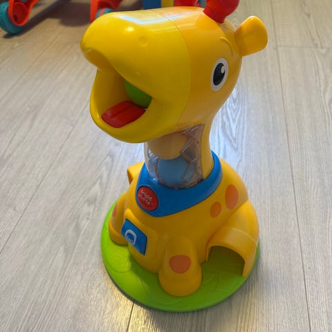 Fisher-Price leke formet som en giraff med to baller. Leken lager lyd når man putter ballen i munnen på giraffen. Leken er laget av plast og designet for små barn, med ulike teksturer og farger for sensorisk stimulering.