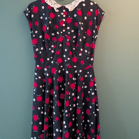 Kjolen er i klassisk 60-talls stil og er i tråd med det en løs og lett kjole. Det er ingen merkelapper på den, men jeg antar at det vil passe best til en M, men også mindre strl ettersom at den er fin også litt på den større siden:D
