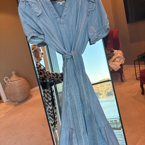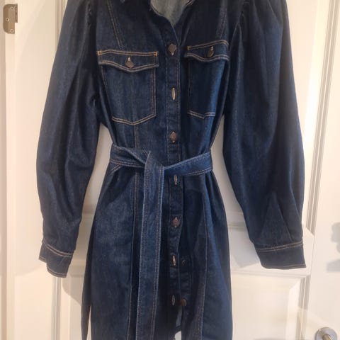 Denimkjole med god stretch. Innsvinget i livet og knapper i front. Selges da den er litt for stor, lang på armene (man kan brette opp).