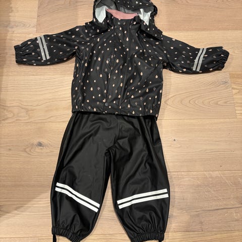 Fint svart regntøy fra Kax (Kappahl). Kan ikke huske at vi har brukt det, men det er i alle fall ikke mange gangene. Hele strikk, ingen hull og uten slitasje.