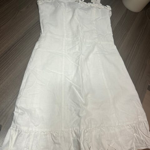 Superfin hvit kjole i bomull fra Urban Pioneers. Foret er i viskose. Knapper hele veien ned foran, glidelås åpning oppe under ene armen og regulerbare stropper. Pent brukt en gang eller to. Selges fordi den er litt trang til meg.