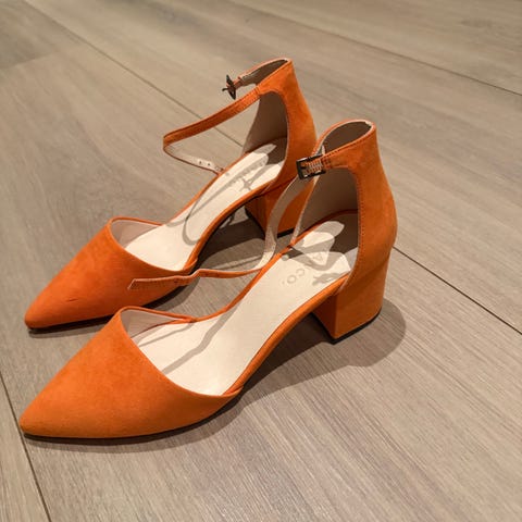 H&M pumps i størrelse 37, i oker/sennepsgul farge. Skoene har en åpen tå med scalloped kantdetalj og ankelstropp med spenne. Blokkhel.