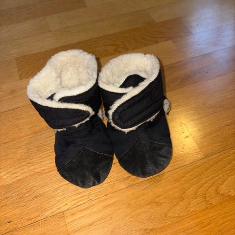 Voksi tøfler/fotposer med ull str 22. Tøflene er hele og pene, men har blitt litt falmet på skinnet, mulig det bare kan fikses med litt skokrem.
