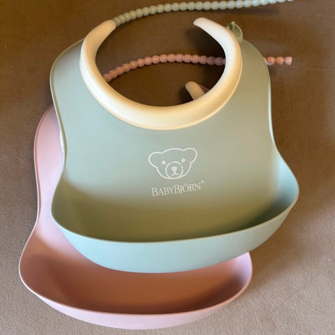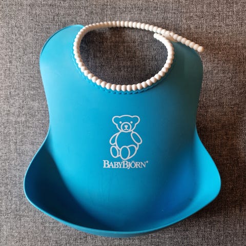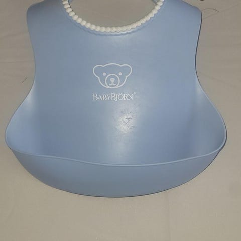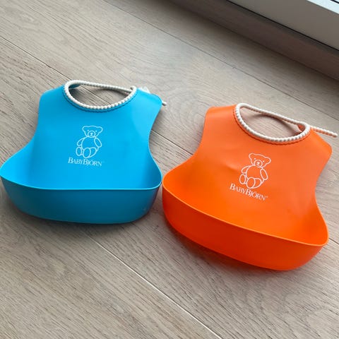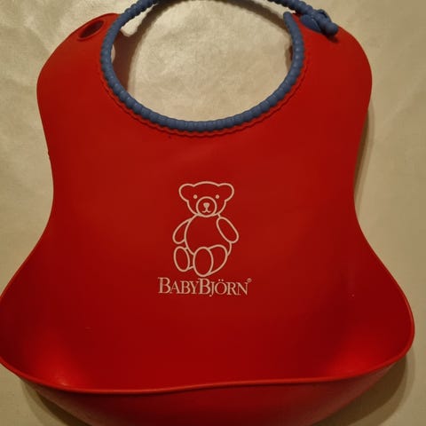 BabyBjörn Smekke i rød plastmateriale med blå kant rundt nakkestroppen. Passer for barn i alderen 6-24 måneder. Designet for å beskytte klær under måltider.