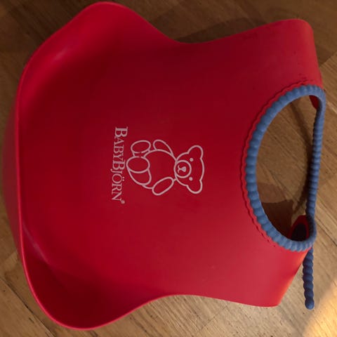BabyBjörn Smekke i rosa plastmateriale med hvit kant rundt nakkestroppen. Passer for barn i alderen 6-24 måneder. Designet for å beskytte klær under måltider.