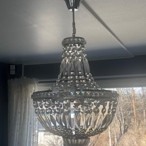 Lampen er pent brukt og fremstår som ny – alle prismer er intakte og den gir et nydelig, varmt lys (se bilde).