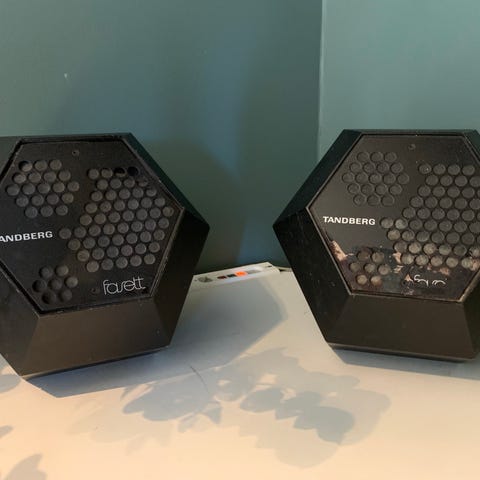 Tandberg fasett høyttalere med ITT 2x20w forsterker. Høyttalerne er tidligere lakkert med helt ok resultat. De er ikke 100 prosent strøkne. Oppsettet spiller fint på passende volum. Det følger med en overgang til phono, så det er enkelt å koble til telefonen eller noe annet. Et veldig fint oppsett synes jeg.