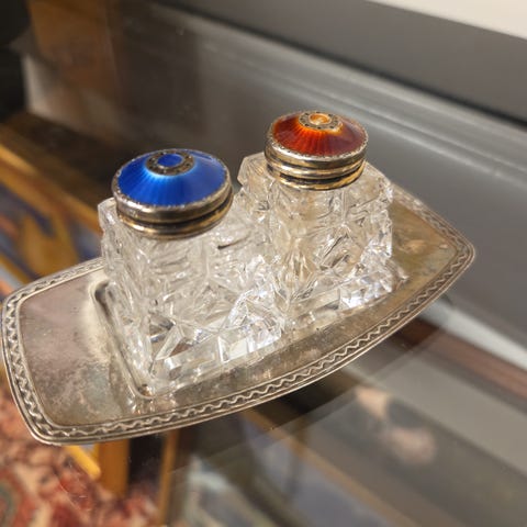 Settet består av bøsser i kuttet glass og et fat i sølv, med lokk dekorert med guilloché-emalje.