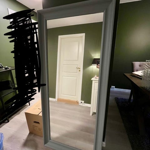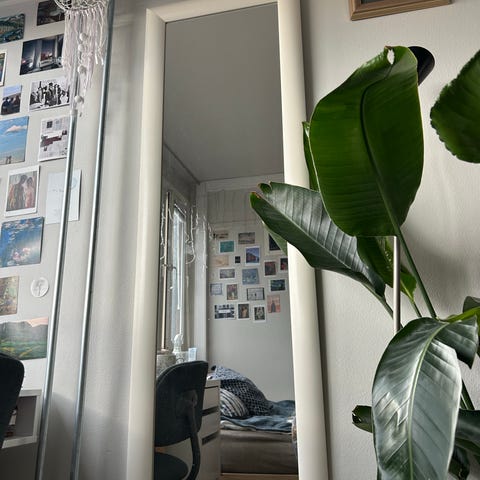 Dett er noe jeg har laget selv. Kjøpte 15 små rammer og 15 små speil fra ike og festet de med dobbelsidige teip og hang de tett sammen så det ser ut som et stort speil☺️ teipen til å fest rammene følger ikke med. Men får kjøpes mange steder:)