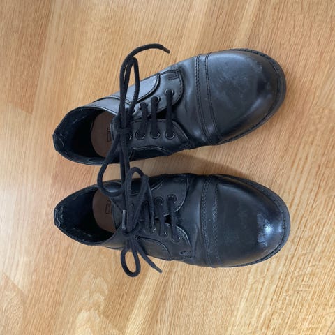 Pensko i størrelse 31, klassisk modell med svart farge. Skoene er laget i skinnmateriale og har snøring for justering. Noen mindre bruksmerker frempå og kan trenge en liten puss men ellers pent brukt.
