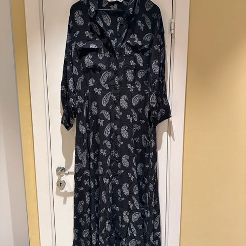 Rett i fasongen, til over knærne. Kjolen har beige/off white farge med svart/mørk mørk blå prikkemønster. Den er laget av lett materiale og har volangdetaljer på ermene. Passer til ulike anledninger.