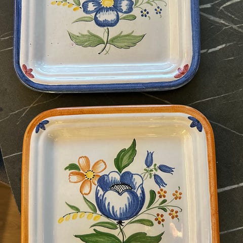 Det avbildede fatet er et keramikkfat med håndmalt blomstermotiv.
