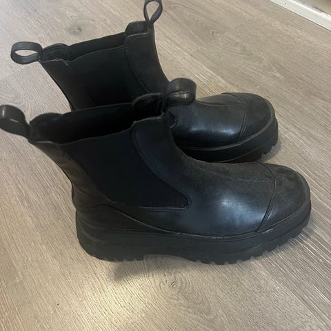 Ganni støvler i størrelse 38 for dame. Støvlene er svarte og laget av robust materiale med elastiske sider for enkel på- og avkledning. De har en solid såle med godt grep, egnet for ulike værforhold og bruk.