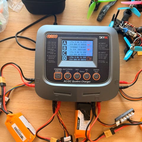 SkyRC T200 er en god multilader som kan lade LiPo, LiHV, LiFe, LiIon, NiHm, NiCd, AGM og Pb batterier. Laderen kan bruke både 12V og 220V kilde inn, så denne laderen vil kunne brukes både i felten på ett bilbatteri og på hobbyrommet plugget rett i veggen. Laderen har to ladeutganger, og hver av de har max ladestyrke på 100W/12A, så på hver av utgangene kan 2cell LiPo lades på 12A, 3cell LiPo kan da lades på ca 9A. Ett 6cell LiPo på ca 4,5A.