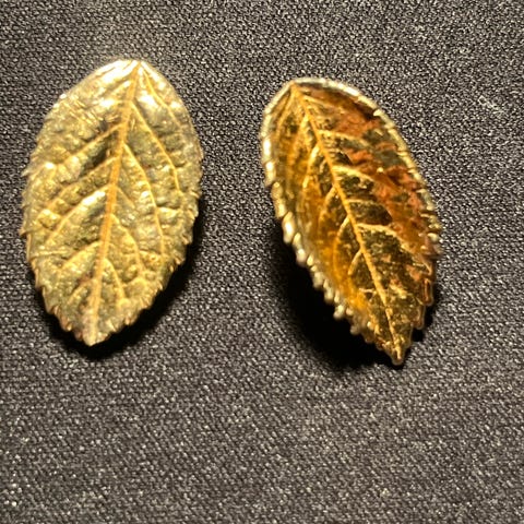 Dette er et gullbelagt bladanheng med klipp til å spenne demn eller henge på halskjede