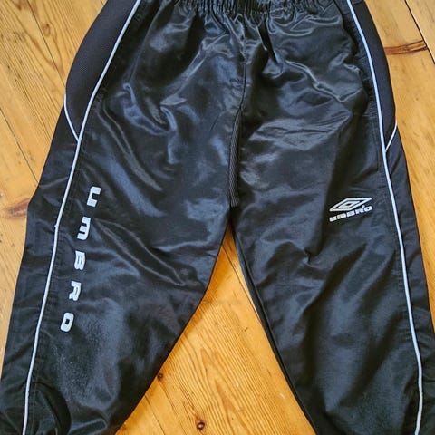 Umbro bukse i svart farge, størrelse 152 for barn. Laget av polyester og elastan, med elastisk midje og snøring. Designet med Umbro-logo og dekorative detaljer på bena. Egnet som trenings- eller fritidsbukse.