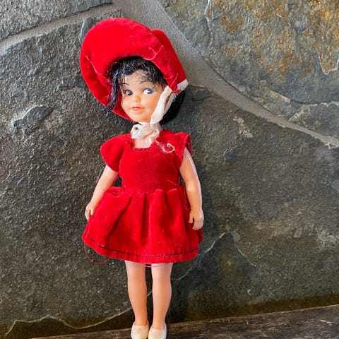 Dukke fra 70-tallet. 26 cm. Gummi fjes og frotté klær (trenger en vask). Bruksmerker.
