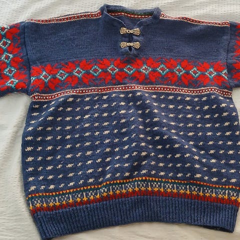 Selger flere flotte ullgensere og kofter i ulike mønstre og farger.