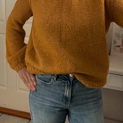Mykeste kløfri flott hjemmestrikket genser i alpakkaull. Skjønn gulfarge. Såvidt vært i bruk få ganger, fremstår som ny.