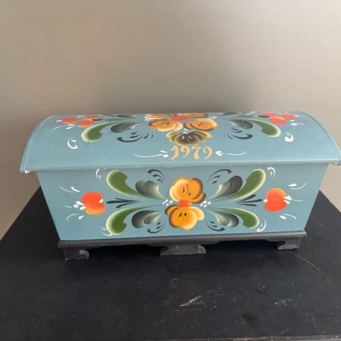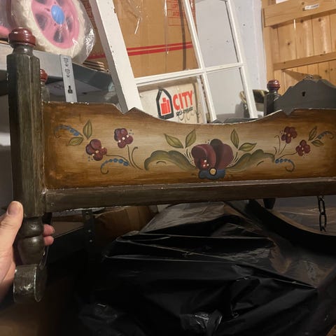 Stor, gammelt rosemalt vugge selges. Fra familiens hytte. Koselig pynte gjenstand, oppbevaring. Må hentes 🙂