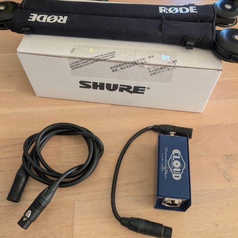Shure SM7B Mikrofon, Focusrite Scarlett 2i2 Lydkort, og rode psi arm