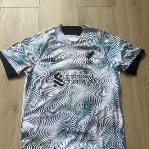 Nike Liverpool fotballtrøye i størrelse L. Trøyen er gul med røde detaljer og laget for herre. Den er laget av pustende materiale egnet for fotballaktivitet.