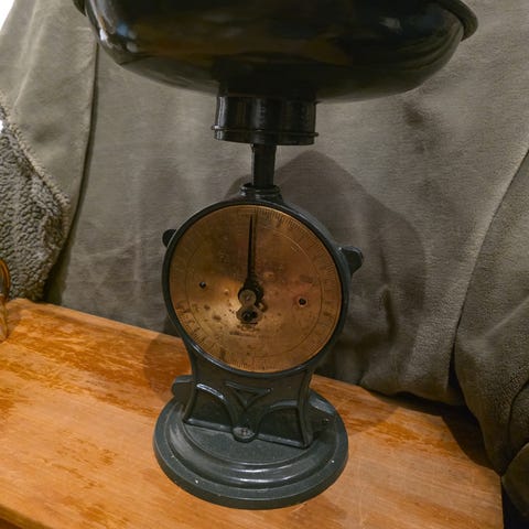 Gammel kjøkkenvekt laget i metall med rund vektplate og analog måler. Vekten har et klassisk design med tydelige måleskalaer og egner seg for veiing av matvarer eller andre gjenstander. Produktet er robust og har en vintage stil.