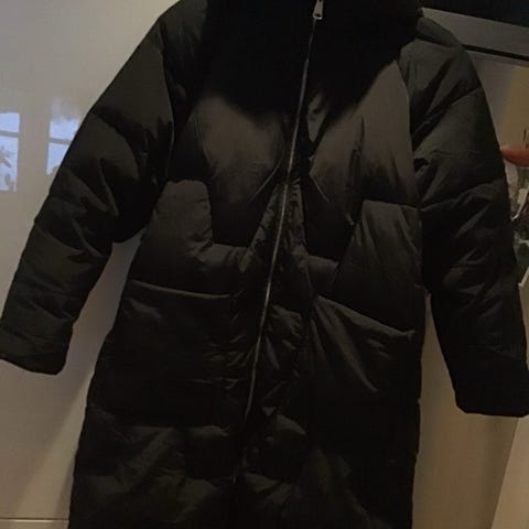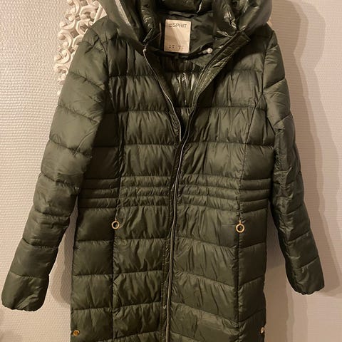 Pent brukt dunkåpe ,,vendbar, grønn og sort med avtagbar hette som har avtagbar fuskepelskant