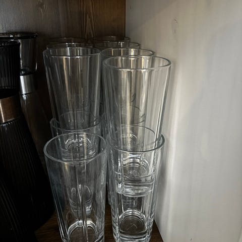 Rosendahl glasskrus sett bestående av flere glass i klart glassmateriale. Glassene har en enkel og rett design og varierer i størrelse. Noen glass har mindre skader eller hakk på kanten. Egnet for servering av drikkevarer. I tillegg er noen glass blitt misfarget.