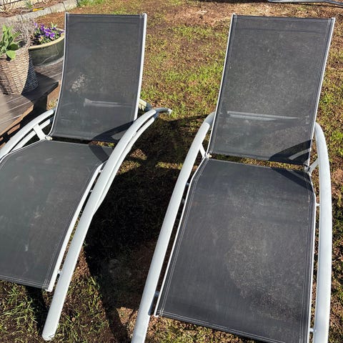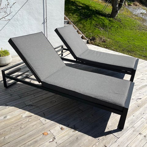 To stk solsenger i svart kunstrotting med justerbar rygg