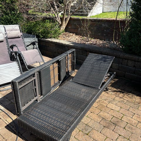 2stk solsenger laget av svart kunstrotting med justerbar ryggstøtte. Leveres med avtakbare ben for enkel oppbevaring og transport. Egnet for utendørs bruk på terrasser eller hager.