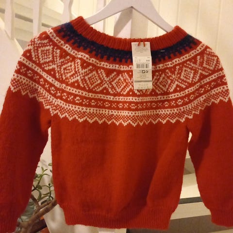 Genser med fine motiver til barn. Laget av ull og dralon. Størrelse er lilla 2/3 år, lende 35 cm bredde 27 cm arm fra hansen31 cm. Lise grå og grå størrelse 3/4 år lende36 cm bredde 30 cm arm fra halsen 38 cm Krem ferge 4/5 år lende 37 cm bredde 30 cm arm fra halsen 41 cm. 650 kr pr stk.