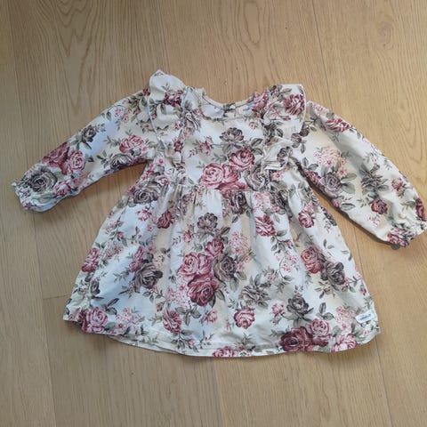 Newbie flerfarget kjole for barn i størrelse 86, designet for jenter. Kjolen har et flerfarget blomsterprint og er laget i et lett og luftig materiale. Den har flere lag med volanger som gir et dekorativt uttrykk, samt korte ermer med volangdetaljer.