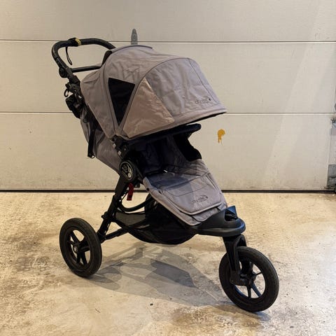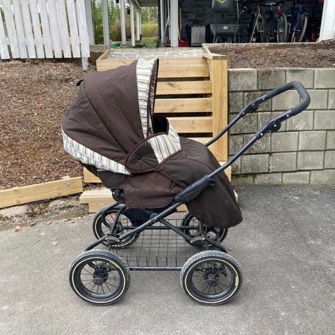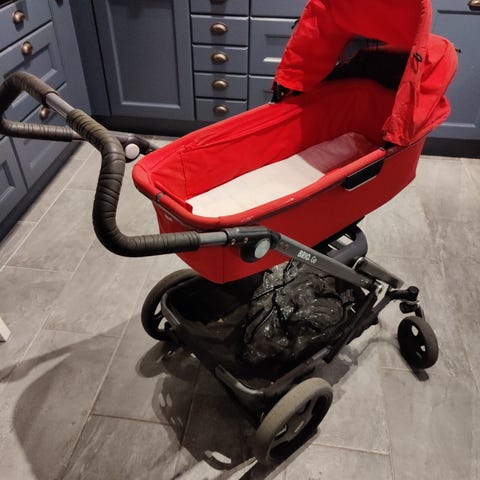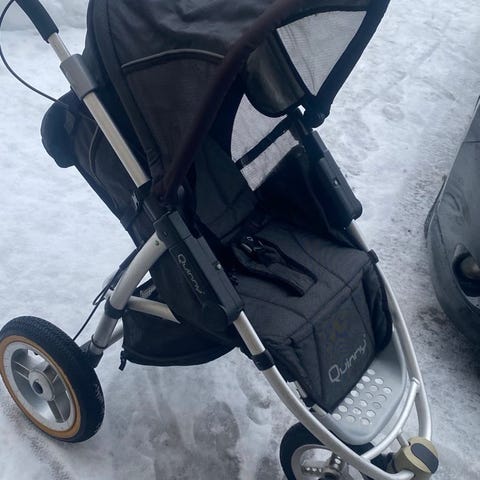 En grei ekstravogn å ha. Quinny barnevogn med justerbart sete, som kan vendes. Utstyrt med solskjerm, 3-punkts sikkerhetssele og lagringskurv under. Rammen er laget av metall, og setet har polstret stoff i mørk farge. De store dekkene kan pumpes opp, og gjør trillingen mer behagelig. Bøyle mangler.