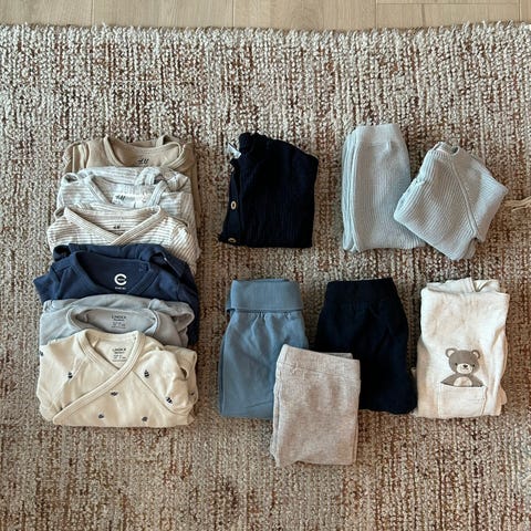 Bestående av 5 pysjamas, 11 bodyer og 6 bukser