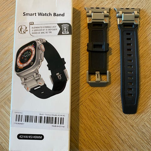 Apple Watch Series 3 smartklokke med svart reim. Klokken har en kvadratisk skjerm og flere sensorer på baksiden for helse- og aktivitetsmåling. Reimen er perforert for bedre ventilasjon. Passer for daglig bruk og treningsaktiviteter.