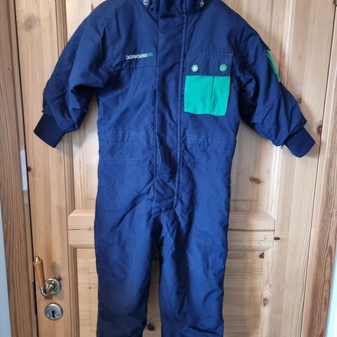 Didriksons barnedress i blå farge, størrelse 92, designet for unisex. Dressen har hette og flere lommer med glidelås. Materialet er egnet for utendørs bruk og gir beskyttelse mot værforhold.