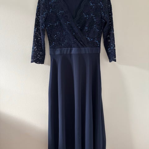 Paljettkjole med asymetrisk chiffon-overlag i fargen marineblå. Det står str 46 i kjolen, men den passer meg som er str 42. Noen bilder er fra nett. Der finner du målene på kjolen på nederste linje. Lengden er 99cm fra skulder og ned. Det er passelig stretch i stoffet til å være behagelig på, men også sitte pent på.