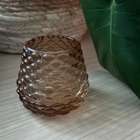 Til telys/planter, oppheng, i klart glass med struktur.