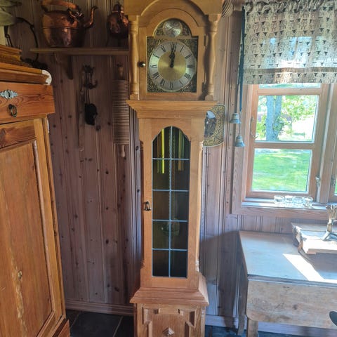 Veggklokke med pendel og messinglodd fra 1975.