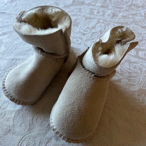 Skoposer til baby i 100% ull. Står merka med str S, vi har brukt dei til baby frå str 50. Fine å bruke til bæring i sjal eller liknande. Har nuppa seg ein god del, men er elles heile og fine.