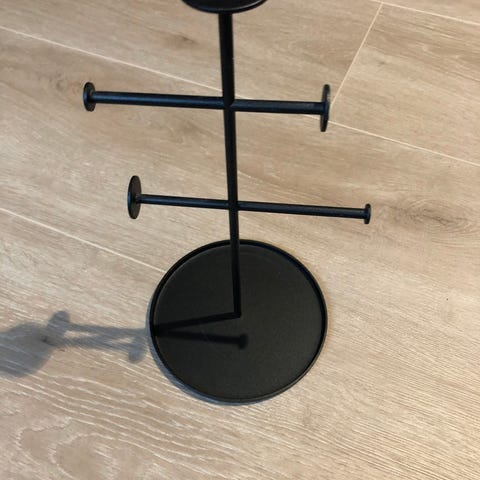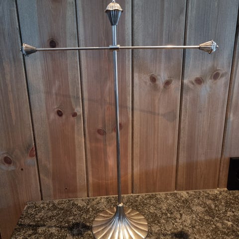Pent og solid smykkestativ i sølv. 38 cm høyt og 33,5 cm i bredden på toppen, foten er 13 cm i diameter.