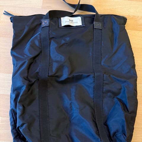 Selger en pent brukt DAY ET skulderveske i fargen svart med glitter stroppene. Laget av stoffmateriale med justerbar skulderrem og doble bærehåndtak. Vesken har glidelåslukking og flere innvendige lommer for organisering. Passer til daglig bruk.