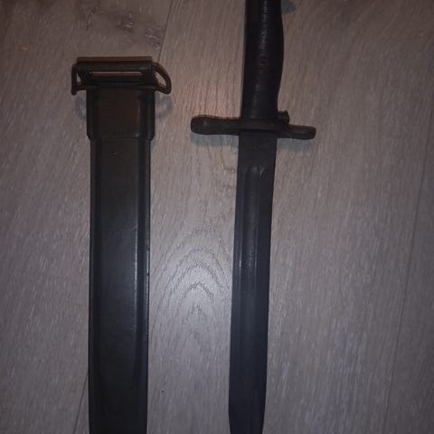 US M1 Garand bajonett produsert i 1943, laget av stål med svart håndtak. Inkluderer grønn metallslire med feste. Bajonetten har tydelige stempler og produksjonsår. Egnet for samlere og historiske formål.