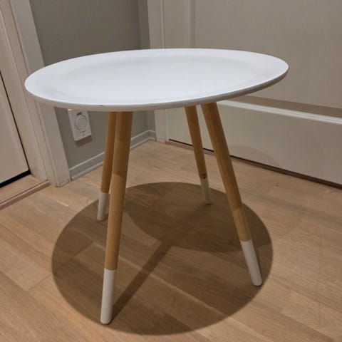Svart rundt sidebord i tre med metallben. Høyde 53 cm og diameter 50 cm.