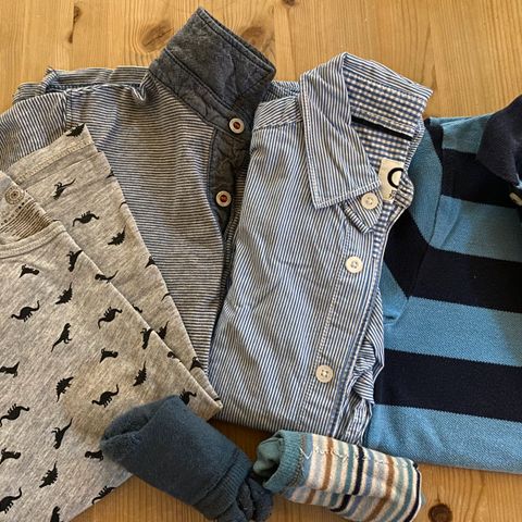 Selger fire t-skjorter og en singlet i str. 146/152. Oppdaget en flekk på piquéskjorten ved fotografering, så har ikke forsøkt flekkfjerning. Ellers er alt helt og flekkfritt.