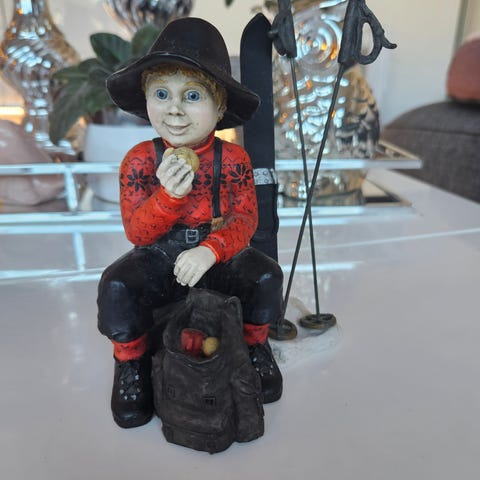 Denne figuren er veldig fin uten noen knatter. MEN - den mangler en ski og en skistav. Den er er ganske fin som den er, men når du ser nærme, så mangler disse 2 tingene på sida. Han er 15 cm høy og 11 cm bred. Koster ny kr. 646,-