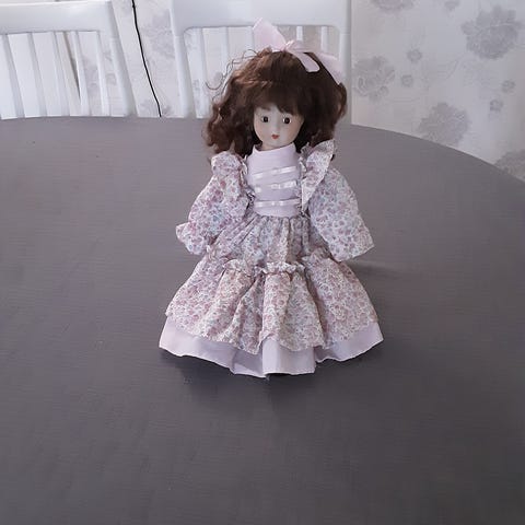 Håndlaget dukke med rosa rutete kjole og hvit strikket lue. Dukken har myk kropp og detaljerte ansiktstrekk. Passer som samlerobjekt eller til dekorasjon.