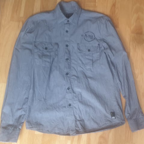 Kaporal Race Custom skjorte i størrelse M for menn. Skjorten er grå med stripete mønster og har flere broderte detaljer og merker, inkludert Gasoil Service og kaporal-logoer. Laget av lett materiale, egnet for casual bruk.
