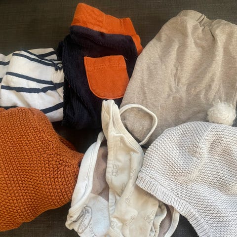 Selger en liten pakke med babyklær i størrelse 74–80. Klærne er pent brukt, rene og uten flekker eller hull. Fine, myke plagg som passer godt til hverdagsbruk.